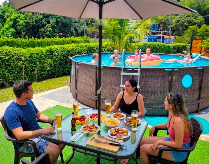 Zona BBQ, Cuenta con piscina privada de 3x3x1 metros redonda, perfecta para refrescarse y compartir con tu familia y amigos, adicional cuentas con la piscina del condominio a tan solo 30 metros de la casa con un kiosco que ofrece vìveres básicos, si necesitas puedes pedir a domicilio si deseas alimentos preparados o mercado específico.