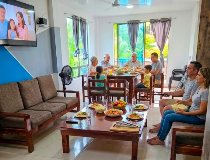 Gran salón social con Wifi, TV por cable y equipo Bluetooth, con cocina equipada, 2 neveras y menaje.